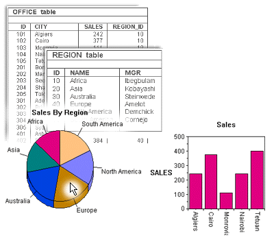 When the user "drills down" (clicks) on a region in the Sales by Region pie chart, Graphics Builder automatically updates the Sales bar chart to reflect the sales data for the selected region.