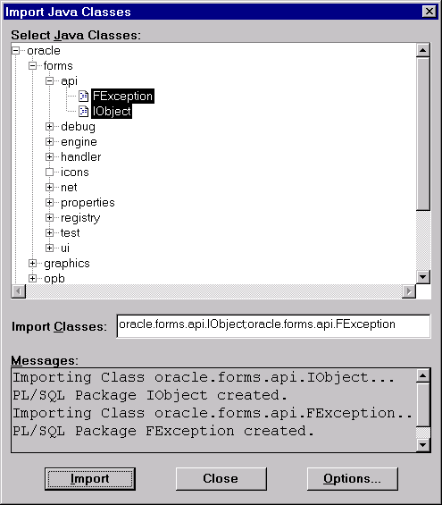 The Java Importer tool provides a convenient Java class browser to easily access and import multiple Java classes. For each Java class selected and imported, the tool generates a PL/SQL package in the current, open module in the object navigator.