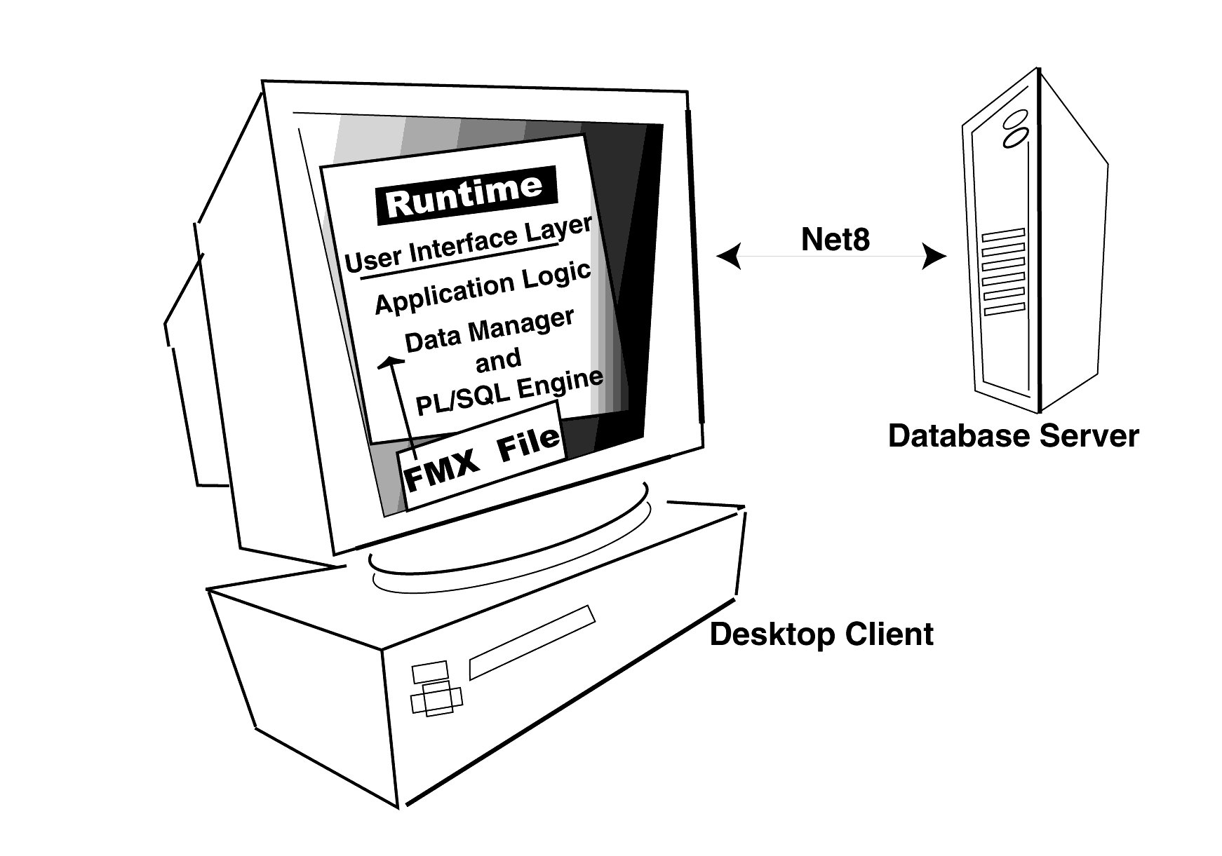 In the client/server-based implementation, shown in Figure 8-1, the Forms Server Runtime Engine and all application logic are installed on the user's desktop machine. All user interface and trigger processing occurs on the client, except for database-server-side triggers and logic that may be included in some applications.